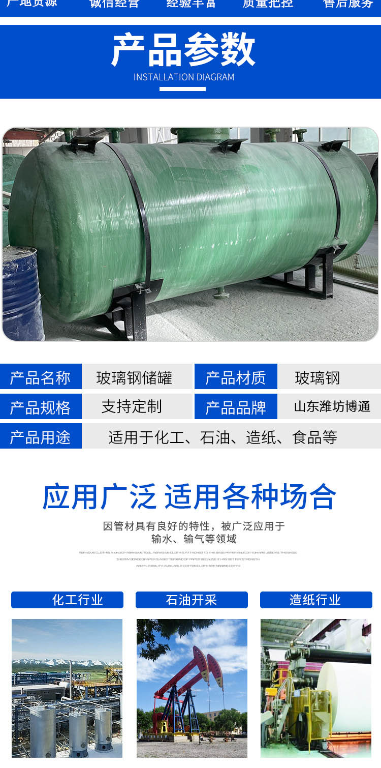 山東環(huán)通復(fù)合材料有限公司成立于2011年,是從事玻璃鋼儲(chǔ)罐產(chǎn)品的企業(yè),公司位于山東濰坊安丘市。玻璃鋼儲(chǔ)罐分為:立式儲(chǔ)罐和臥式儲(chǔ)罐,有1立方、2立方3立方、4立方、5立方、10立方、12立方、15立方、20立方、25立方、30立方、50立方等,顏色分為:綠色、藍(lán)色、黃色等。公司產(chǎn)品主要分為:玻璃鋼儲(chǔ)罐容器,玻璃鋼化糞池,玻璃鋼隔油池,玻璃鋼加砂管道,玻璃鋼脫硫塔,玻璃鋼格柵,玻璃鋼防腐,玻璃鋼儲(chǔ)罐,玻璃鋼管件等。