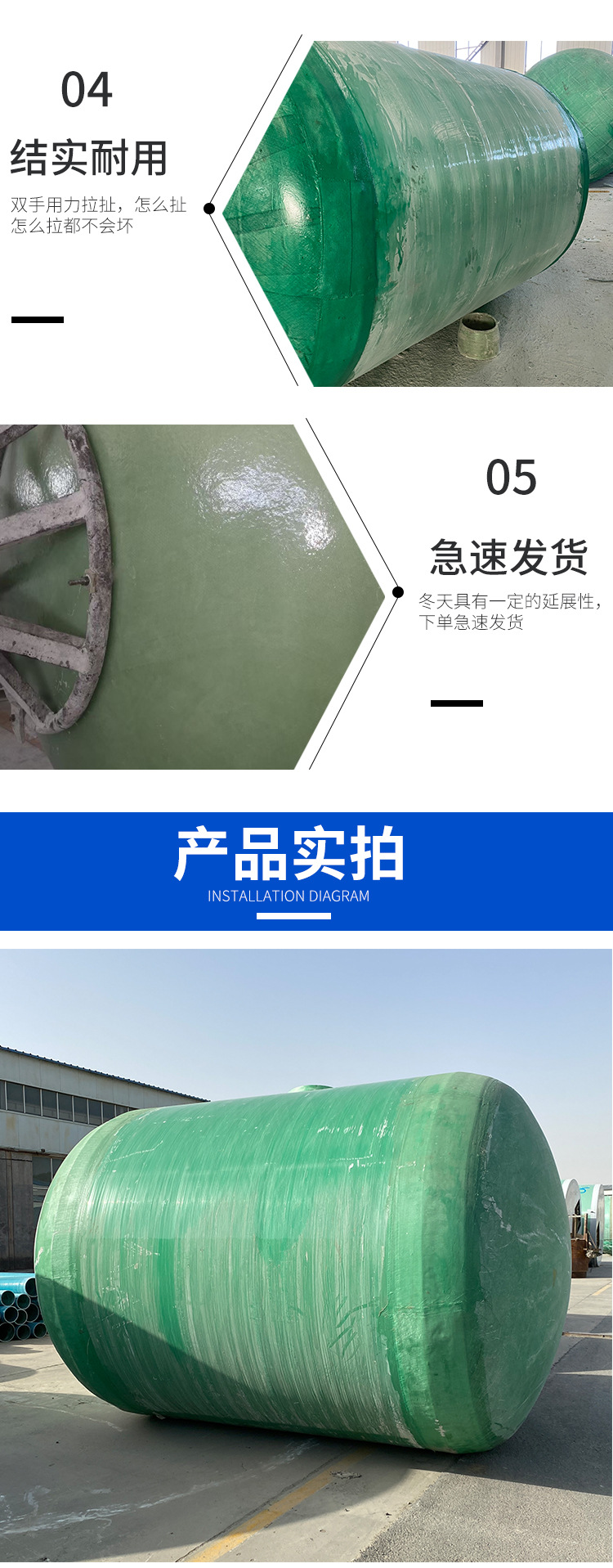 山東環(huán)通復(fù)合材料有限公司成立于2011年,是從事玻璃鋼儲(chǔ)罐產(chǎn)品的企業(yè),公司位于山東濰坊安丘市。玻璃鋼儲(chǔ)罐分為:立式儲(chǔ)罐和臥式儲(chǔ)罐,有1立方、2立方3立方、4立方、5立方、10立方、12立方、15立方、20立方、25立方、30立方、50立方等,顏色分為:綠色、藍(lán)色、黃色等。公司產(chǎn)品主要分為:玻璃鋼儲(chǔ)罐容器,玻璃鋼化糞池,玻璃鋼隔油池,玻璃鋼加砂管道,玻璃鋼脫硫塔,玻璃鋼格柵,玻璃鋼防腐,玻